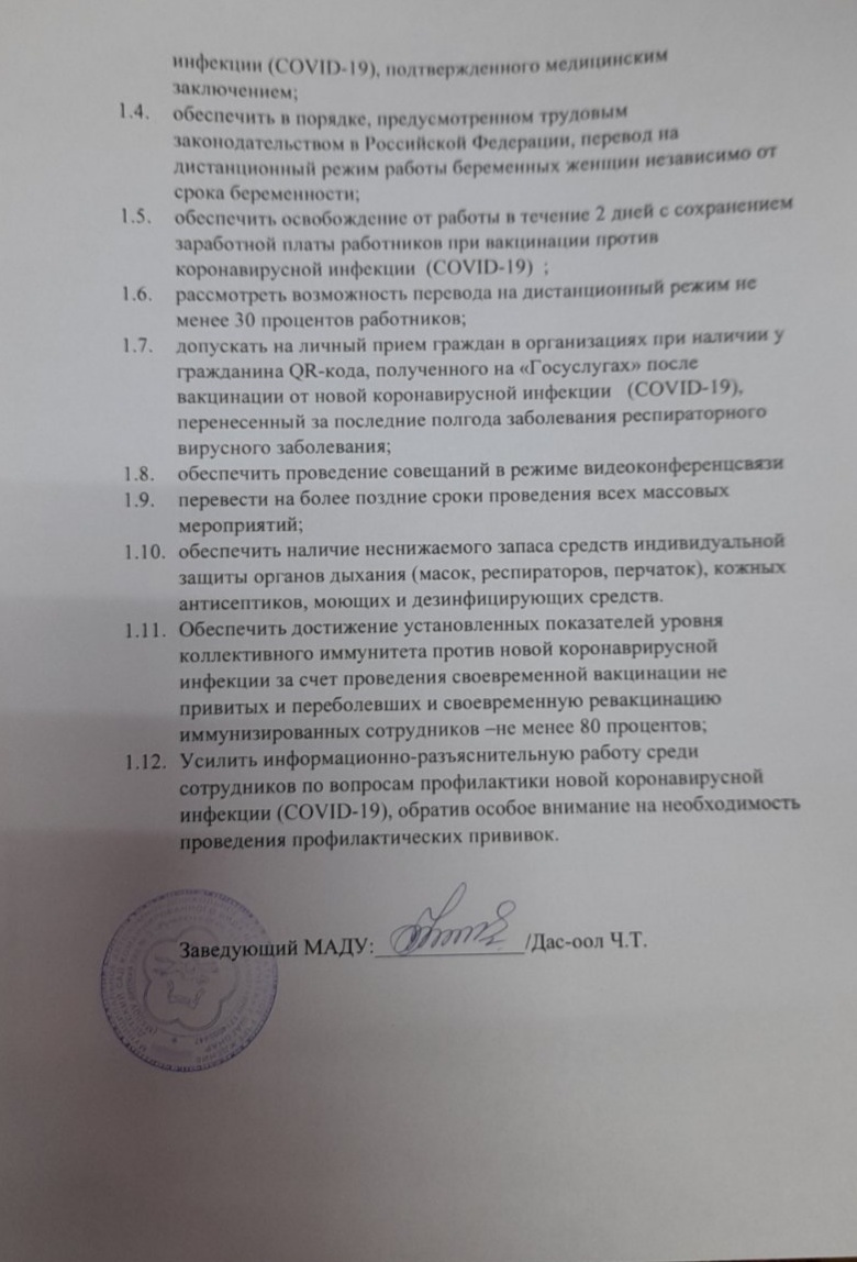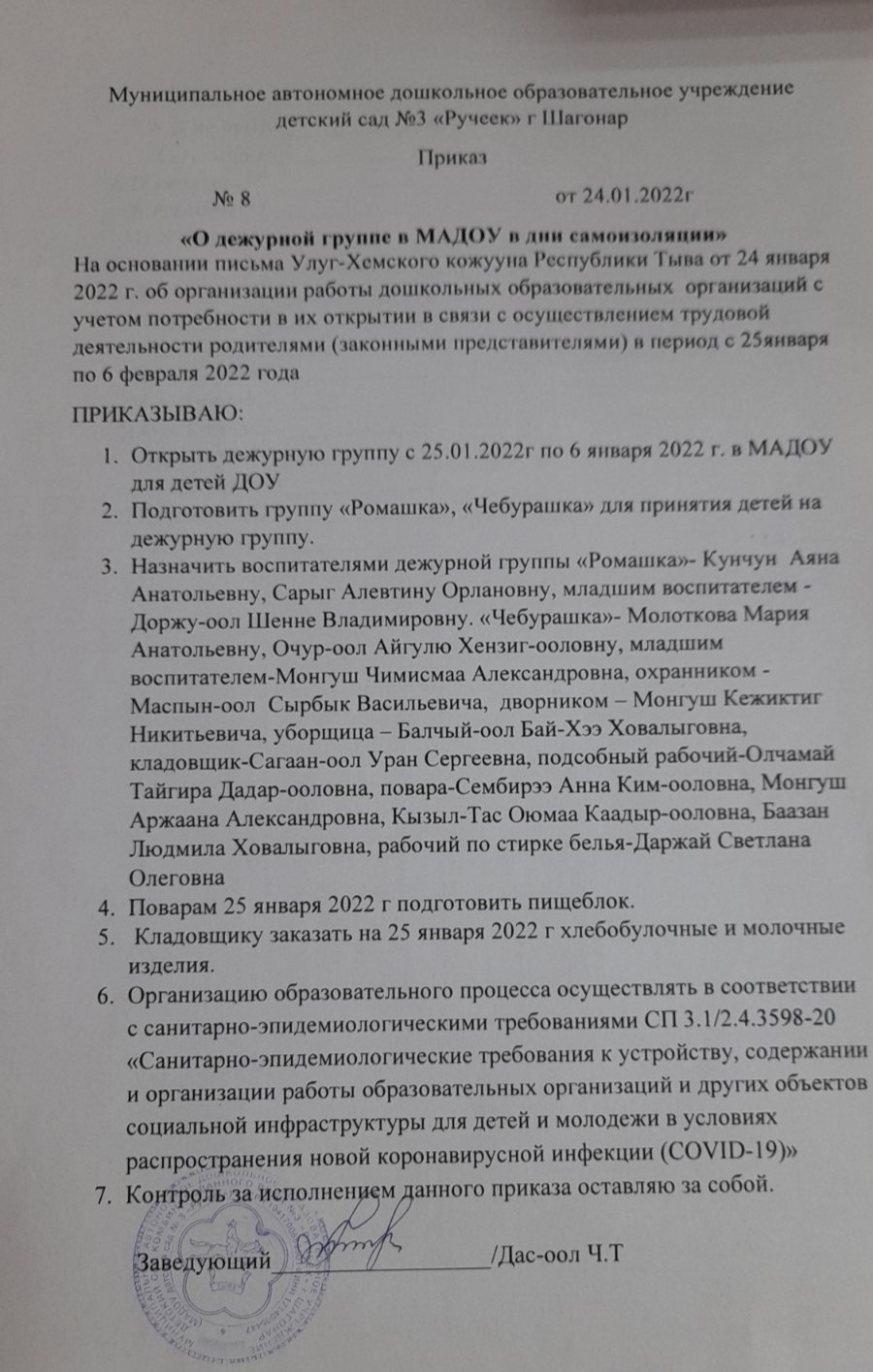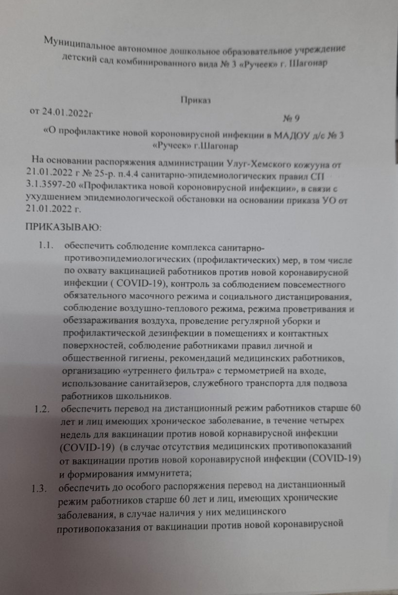 С 26 января по 6 февраля 2022 года в связи с ухудшением эпидемиологической ситуации по распоряжению администрации Улуг-Хемского кожууна 28-р от 24.01.2022г приостановлена деятельность ДОУ кожууна. Во всех ДОУ кожууна функционируют дежурные группы, куда принимают здоровых детей всех работающих родителей (по заявлению).