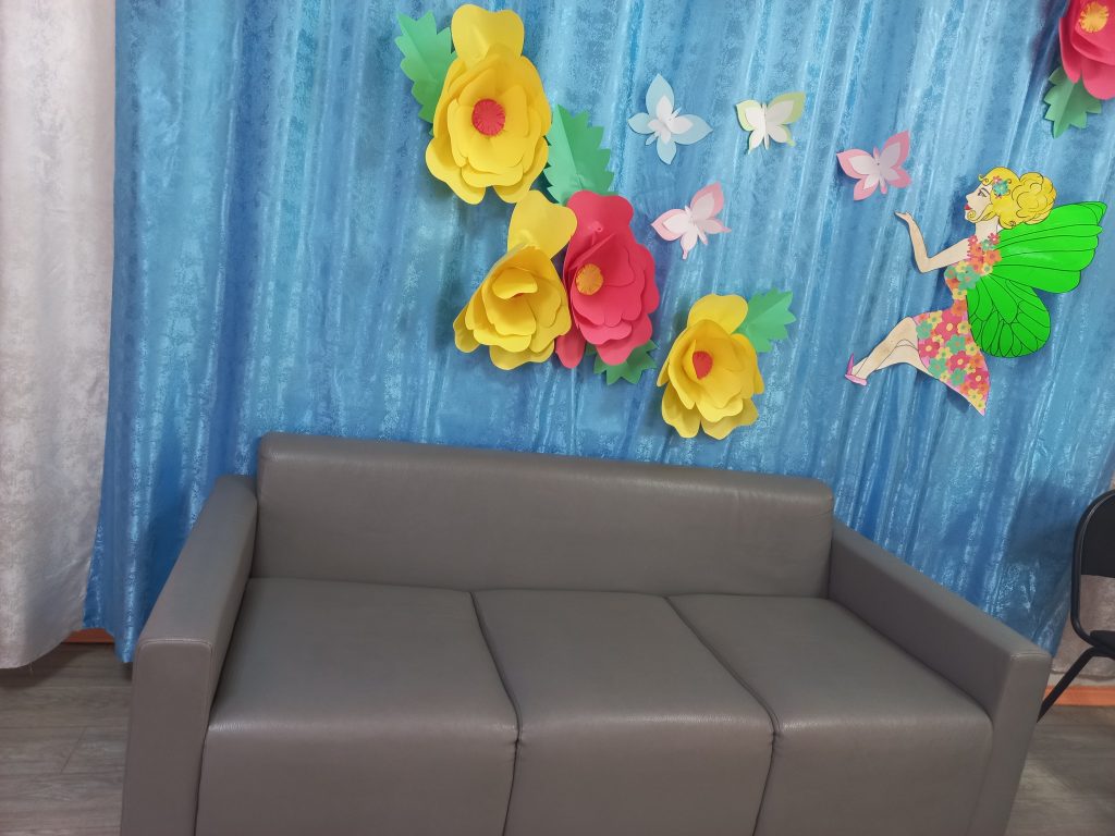Кабинет педагога-психолога , который включает в себя следующие рабочие зоны: пространство для взаимодействия с детьми (мебель детская, малогабаритный мягкий диван, кресло, ковер, аудиоаппаратура, музыкальные записи релаксационной направленности, а также стимульный материал к диагностико-коррекционным методикам и тестам в соответствии с возрастной дифференциацией); пространство взаимодействия со взрослыми (небольшой стол, стулья, стимульный материал к тестам, анкетные бланки, литература по проблемам возрастного развития детей); профессиональная зона для организационно-планирующей работы психолога (письменный стол, стул, компьютер, шкаф для хранения документации).